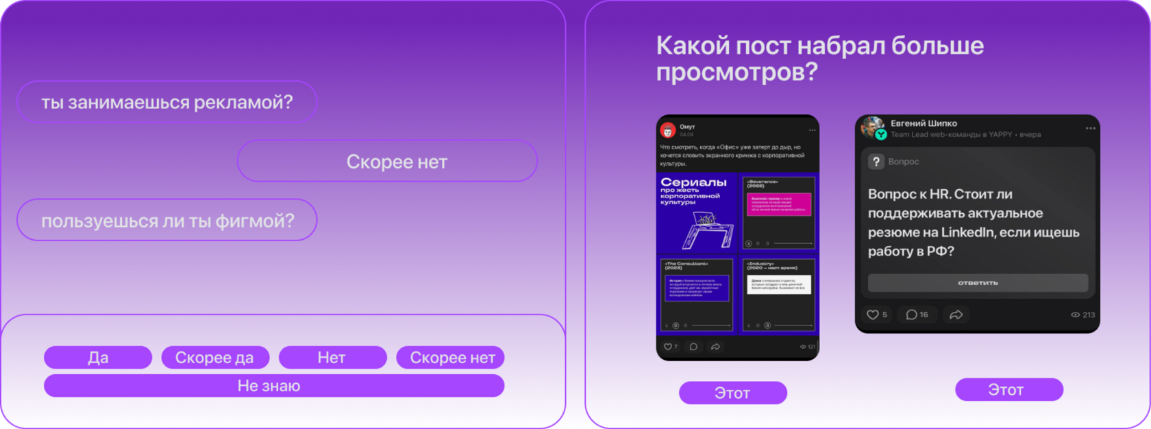 Тест «Выхлоп» предлагает определить, какой из постов набрал больше охвата. Таким образом, пользователь тренирует насмотренность на самые «залетные» форматы постов.